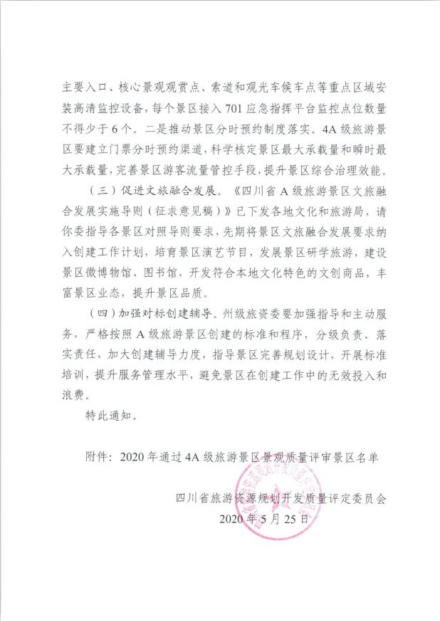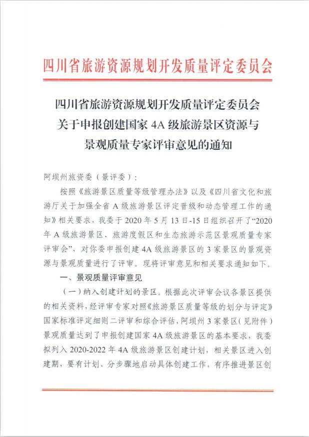 近日,四川省旅游資源規(guī)劃開發(fā)質(zhì)量評(píng)定委員會(huì)通報(bào)了2020年申報(bào)創(chuàng)建4A級(jí)旅游景區(qū)景觀資源與景觀質(zhì)量專家評(píng)審會(huì)結(jié)果。